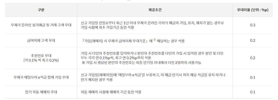 정기예금 첫거래/급여이체실적/추천번호 우대/매일모아 함께가입/만기자동 재예치