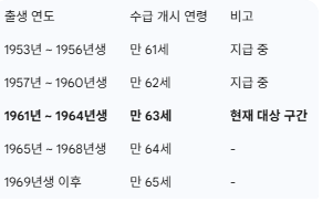 - 수급 연령 도달: 출생 연도별 정해진 나이 도달 시